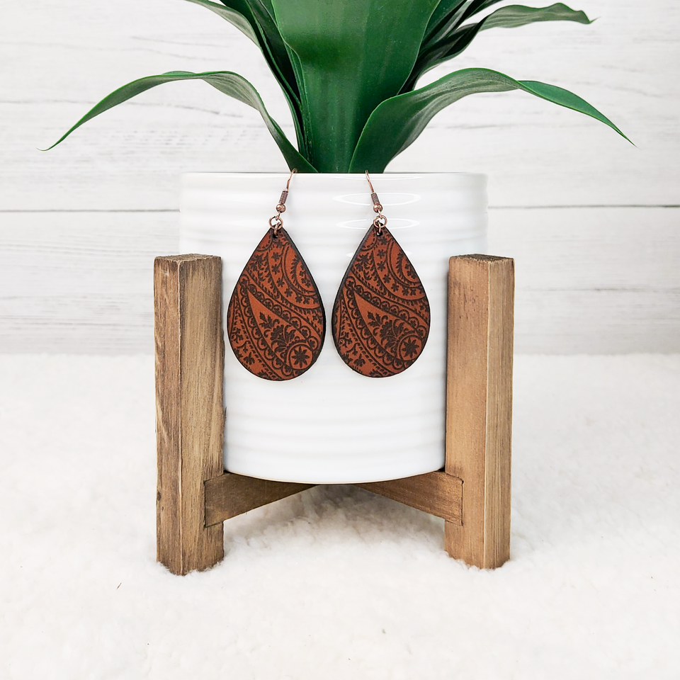 100 % genuine leather laser cut and completed with a red copper earring hook. Complete earring measures 2.75" tall